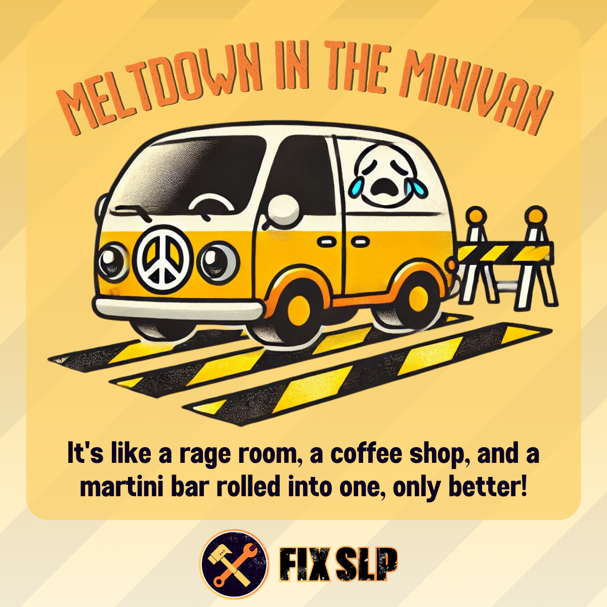 Don't want to cry in your car? Friend, we got you. Climb on into our Fixer minivan and meltdown (tissues not included). Rage about your job, share your SLP sorrows, heck... You can even tell us about that hot PT from your PRN job. It's like a rage room, a coffee shop and a martini bar all in one, but better!