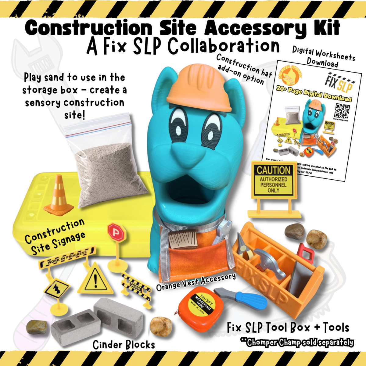 Fix SLP partnered with Chomper Champs to create a fun, construction-themed speech therapy accessory kit designed to support language, articulation, and play-based therapy.