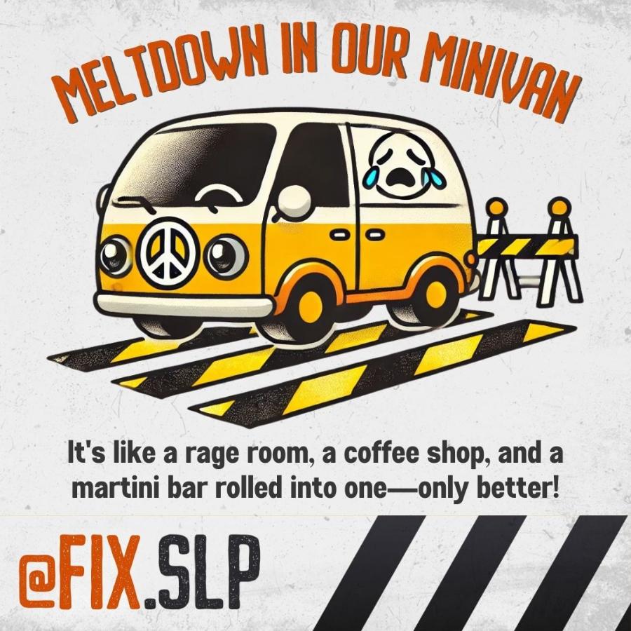 Don't want to cry in your car? Friend, we got you. Climb on into our Fixer minivan and meltdown (tissues not included). Rage about your job, share your SLP sorrows, heck... you can even tell us about that hot PT from your PRN job. It's like a rage room, a coffee shop and a martini bar all in one, but better!